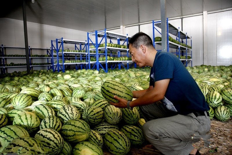 是指在入冷庫前使西瓜品溫盡快冷卻到所規定的溫度范圍,較好地保持其原有品質。預冷更簡單的方法,是在采摘后堆放在田間,利用夜間低溫預冷,在清晨氣溫回升之前入庫。入庫1周內采用制冷機循環冷空氣,借助熱傳導與蒸發潛熱來冷卻西瓜,使西瓜與冷庫溫度一致,一般溫度為8-12℃,相對濕度80%左右,更低庫溫可控制在5-6℃。